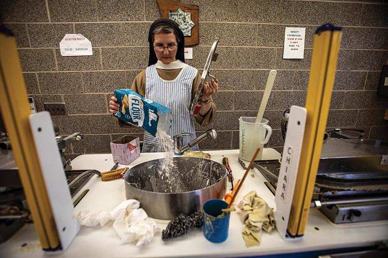 Sister Anne Bartol, a Poor Clare, prepares the batter for altar bread in the bakery at the Monastery of St. Clare in Langhorne, Pa., July 21. (CNS photo/Chaz Muth)