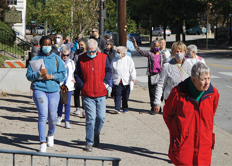 People in Louisville, Ky., participate in the “Walking Together: Pilgrimage for Racial Justice” Oct. 16, 2021. The event included a pilgrimage from the Cathedral of the Assumption to Presentation Academy, where the 150 or so participants listened to a panel of members of the Sisters of Charity of Nazareth, Ky., discuss the congregation’s “own pilgrimage” — from its early years as a slaveholder to its efforts today for racial justice. (CNS photo/Ruby Thomas, The Record)