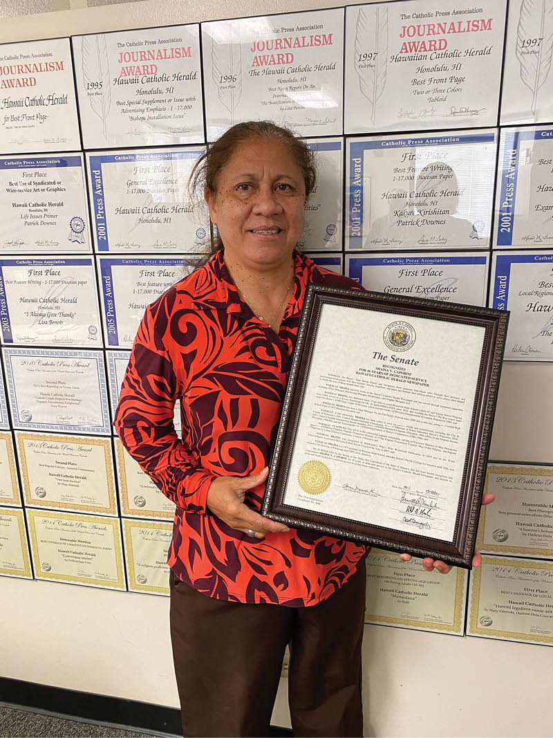 The Hawaii Catholic Herald’s longest employed staff member, Shaina Caporoz, displays a framed commendation given to her Oct. 8 by the Senate of the State of Hawaii on the occasion of her 46th anniversary with the newspaper. Caporoz is the Herald’s bookkeeper and advertising manager. The senate also recognized her accomplishments as a Roosevelt High School soccer coach, as a member of numerous civic boards and commissions including the City and County of Honolulu’s 2021 Council Reapportionment Commission, and her extensive work with the scholarship pageant community. The Hawaii Catholic Herald is proud to have the talented Caporoz as an employee, the longest working in the downtown diocesan chancery. (HCH photo | Anna Weaver)