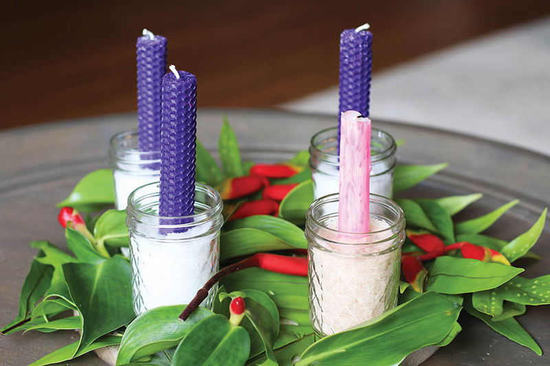 If you can’t find pink and purple candles, get white ones and paint or color them with markers. (See the pictured pink candle at top left.) Speaking of candles, if you can find and afford beeswax ones, they last a lot longer and produce less smoke than other kinds of candles.