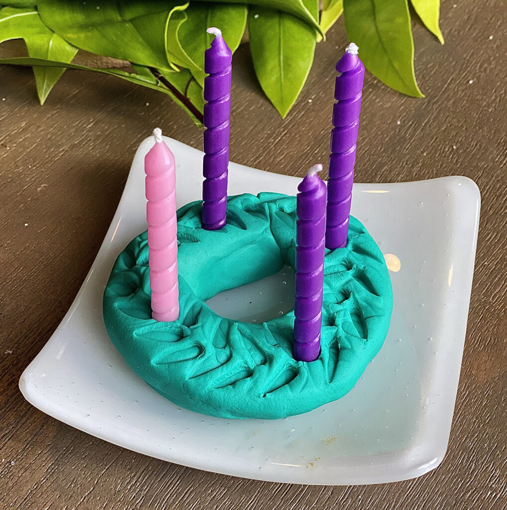Need a really simple and perhaps small Advent wreath activity to do with your kids or to give to the young adults in your life that they’ll think is fun and doable? Put together a kit with green playdoh/molding clay, pink and purple birthday candles, a box of matches, and the weekly Advent prayers. It’ll bring out the inner child of any adult. Pipe cleaners are another easy option that can be shaped into candles and a wreath.