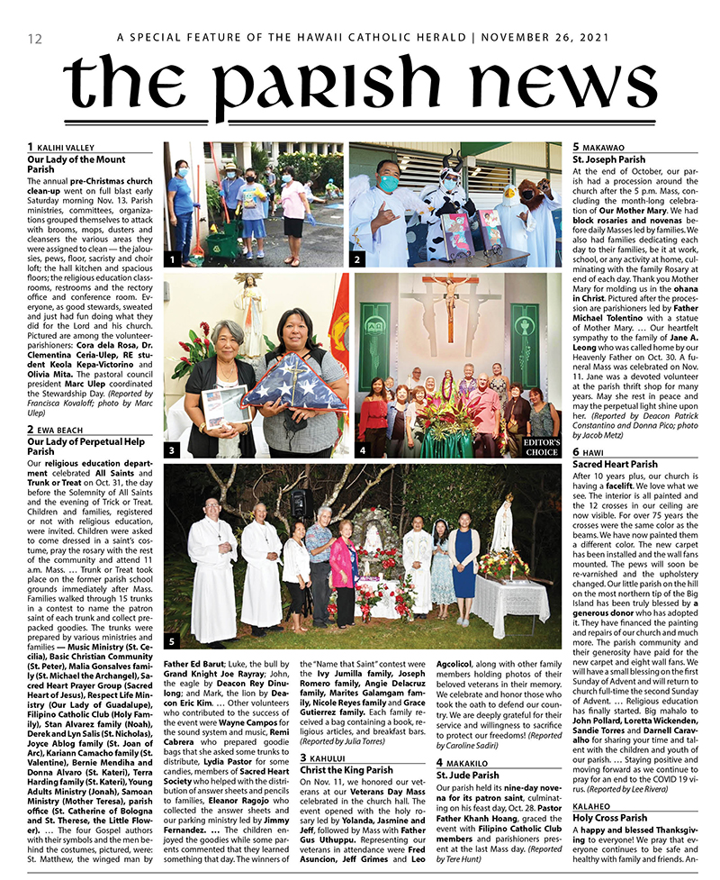 The Parish News: Nov. 26, 2021 11/24/2021 by Hawaii Catholic Herald Click here for a pdf of The Parish News section, Nov. 26, 2021.