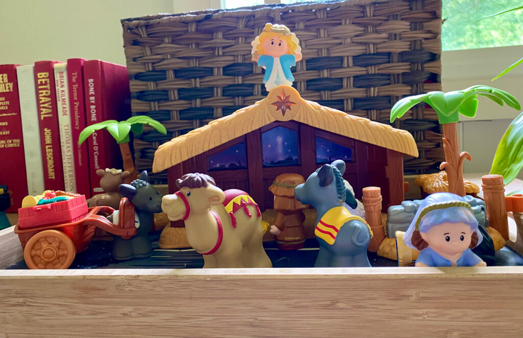 At first, I had no idea what she was talking about. But when I realized she was talking about the Virgin Mary figurine, I racked my brain to think where she might have gone. Then I remembered that I’d put the small plastic Mary in with the ornaments after she’d gotten separated from the rest of the set while we packed up our Christmas decor. I found her, along with a wayward donkey and bale of hay, and put them back with the rest of the kids’ creche.