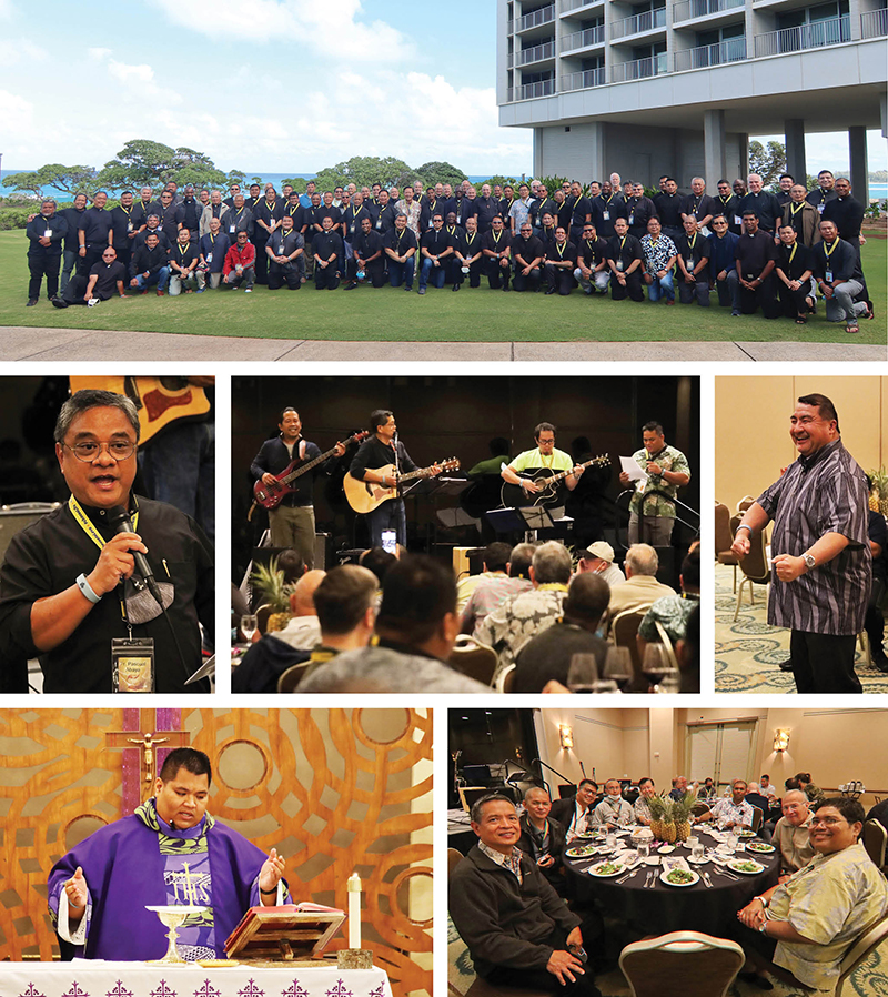 If you wondered where your parish priests disappeared to last week, they were all on Oahu’s north shore at the Turtle Bay Resort for their annual Convocation of Priests, five days away for the men to put aside their collars and cassocks and contemplate, talk, pray, learn, listen, socialize and play music. More than 80 priests attended the Nov. 29 to Dec. 3 gathering. Top photo, Hawaii’s priests pose for a group shot. Second row from left, Father Pascual Abaya, rector of the Cathedral Basilica of Our Lady of Peace; a musical priestly foursome entertains; La Salette Father Edwin Conselva, pastor of St. Theresa Parish in Kekaha. Third row, the most recently ordained, Father Ese’ese Tui, presides at Mass; communal meal time. (Photos courtesy of Dann Ebina)