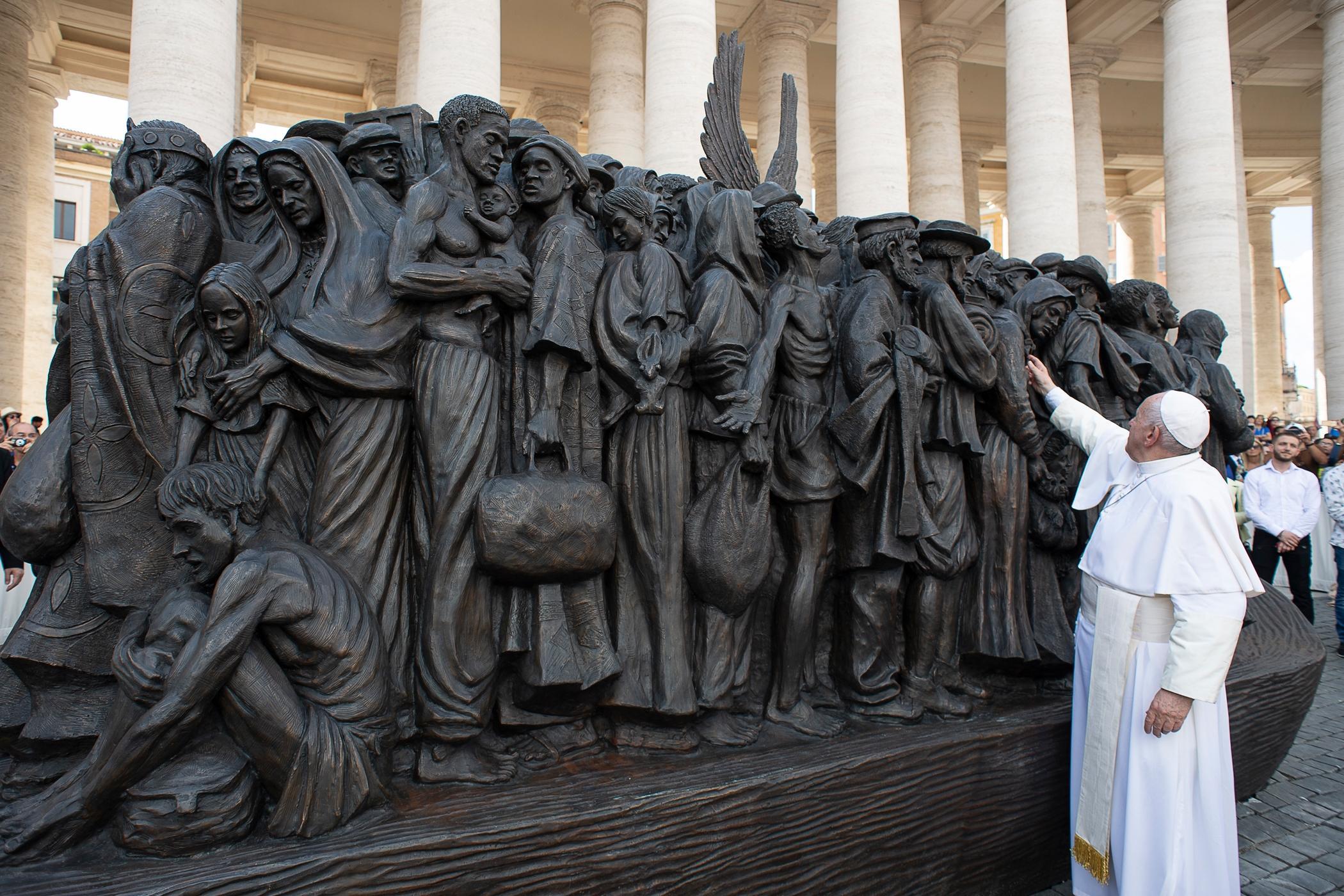 Pope Francis attends the unveiling of a large bronze statue titled, “Angels Unawares,” by Canadian artist Timothy Schmalz, in St. Peter’s Square at the Vatican Sept. 29, 2019. The statue depicts a group of migrants and refugees on a boat. (CNS photo/Vatican Media)