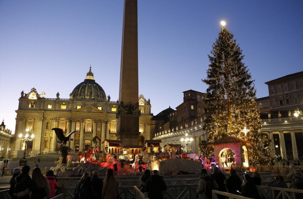 Next to the Andean Nativity stands a 90-foot-tall fir tree from a sustainably-managed forest in northern Italy, where the round wooden ornaments were also made. Representing Christ as the “tree of life,” it reflects “the light of love that continues to shine in the nights of the world.”