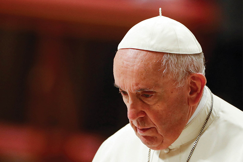 Pope Francis leaves at the conclusion of an evening prayer service in St. Peter’s Basilica at the Vatican Dec. 31, 2021. The traditional service on New Year’s Eve is to give thanks for the past year. (CNS photo/Remo Casilli, Reuters)
