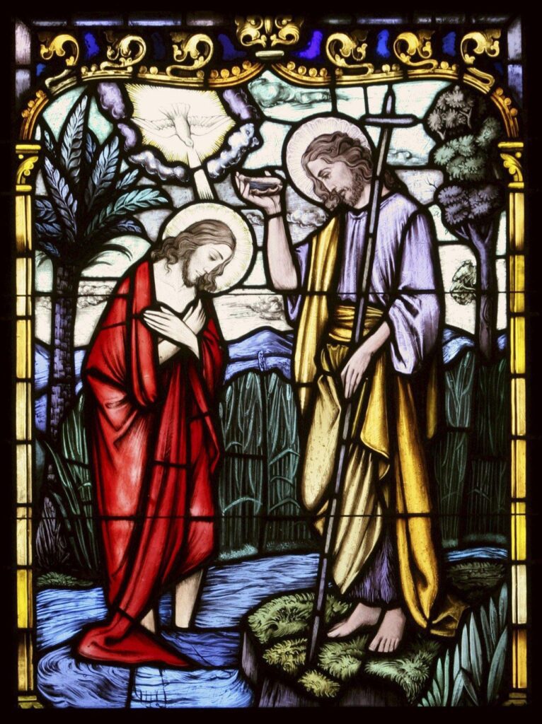 Christ’s baptism by John the Baptist at the Jordan River is depicted in a stained-glass window at St. Therese of Lisieux Church in Montauk, N.Y. The feast of the Baptism of the Lord, celebrated Jan. 13 in 2008, marks the end of the Christmas season. (CNS photo/Gregory A. Shemitz, Long Island Catholic) (Dec. 11, 2007)