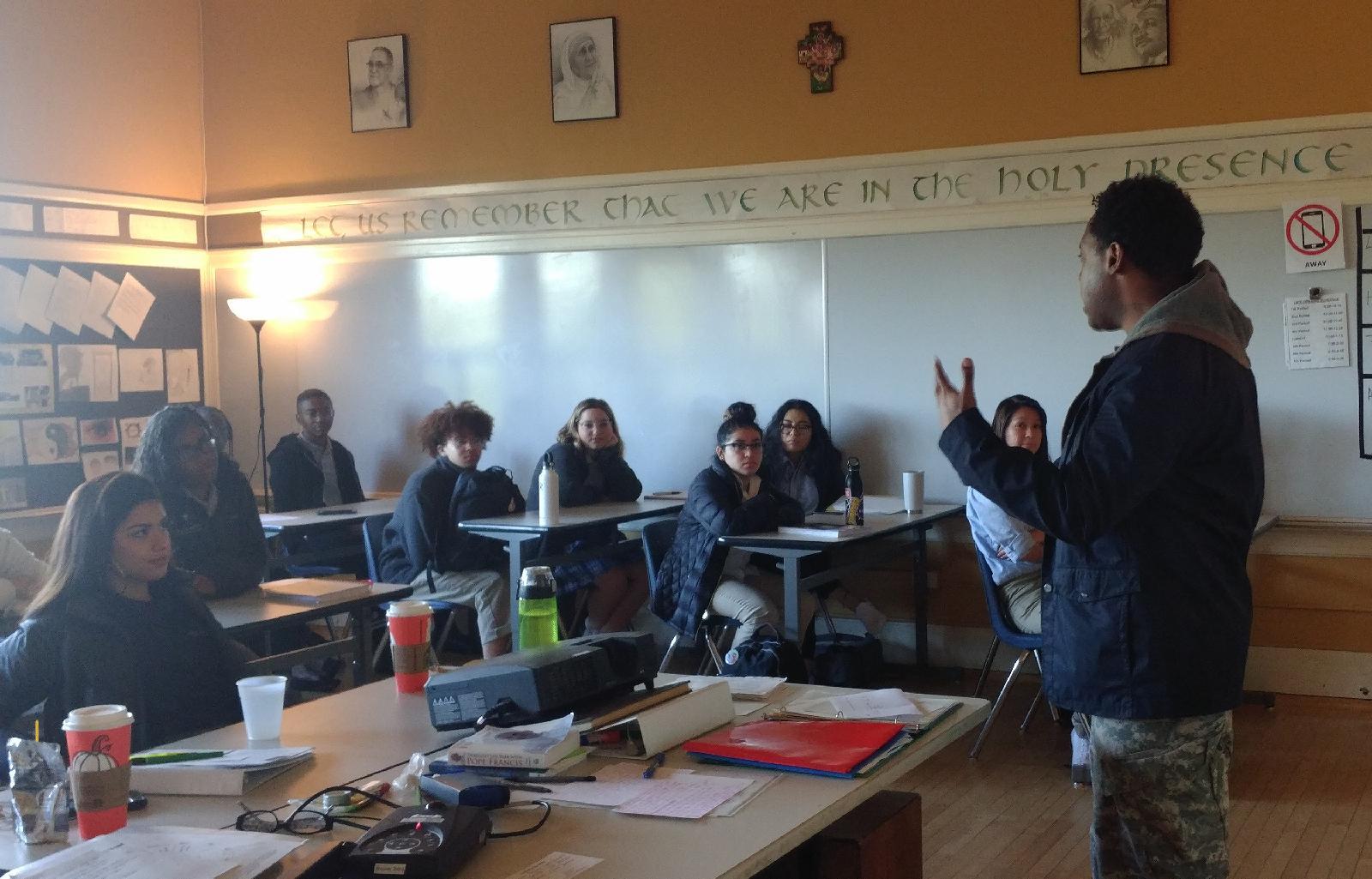 Andrae Goodnight, an actor who portrays Father Augustus Tolton, the first recognized American diocesan priest of African descent, speaks to students Oct. 26, 2017, at De La Salle North Catholic High School in Portland, Ore. He talked about what his role in “Tolton: From Slave to Priest” has meant to him. (CNS photo/courtesy St. Luke Productions)