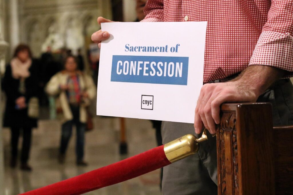 In this 2016 file photo, Dustin DiSalvo directs people to reconciliation stations during a Holy Hour for young adults at St. Patrick’s Cathedral in New York City. (CNS photo/Gregory A. Shemitz)