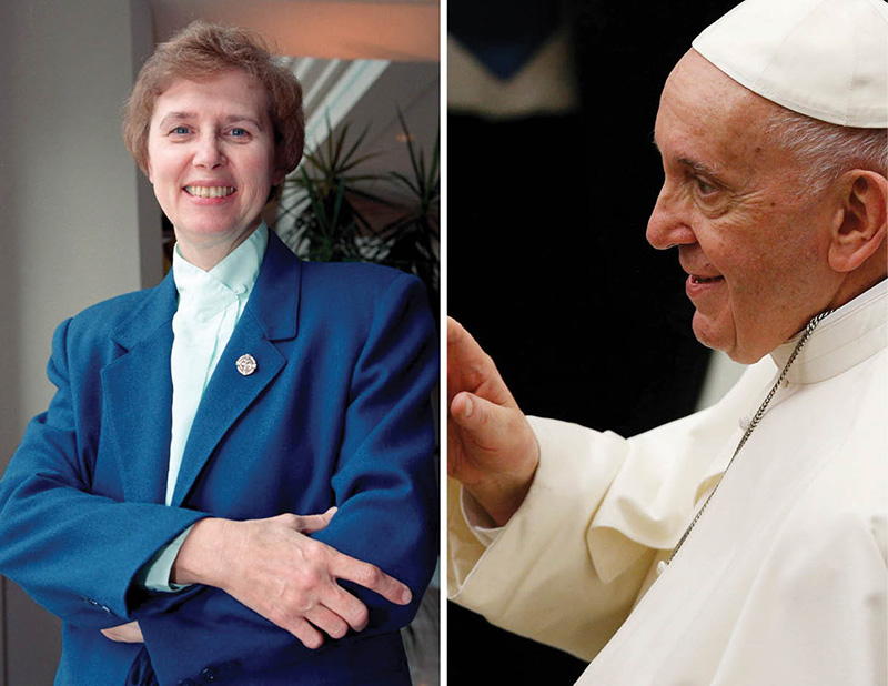 Loretto Sister Jeannine Gramick, seen in this 2001 file photo, and Pope Francis, are seen in this composite photo. (CNS composite; photos by Nancy Wiechec and Paul Haring)