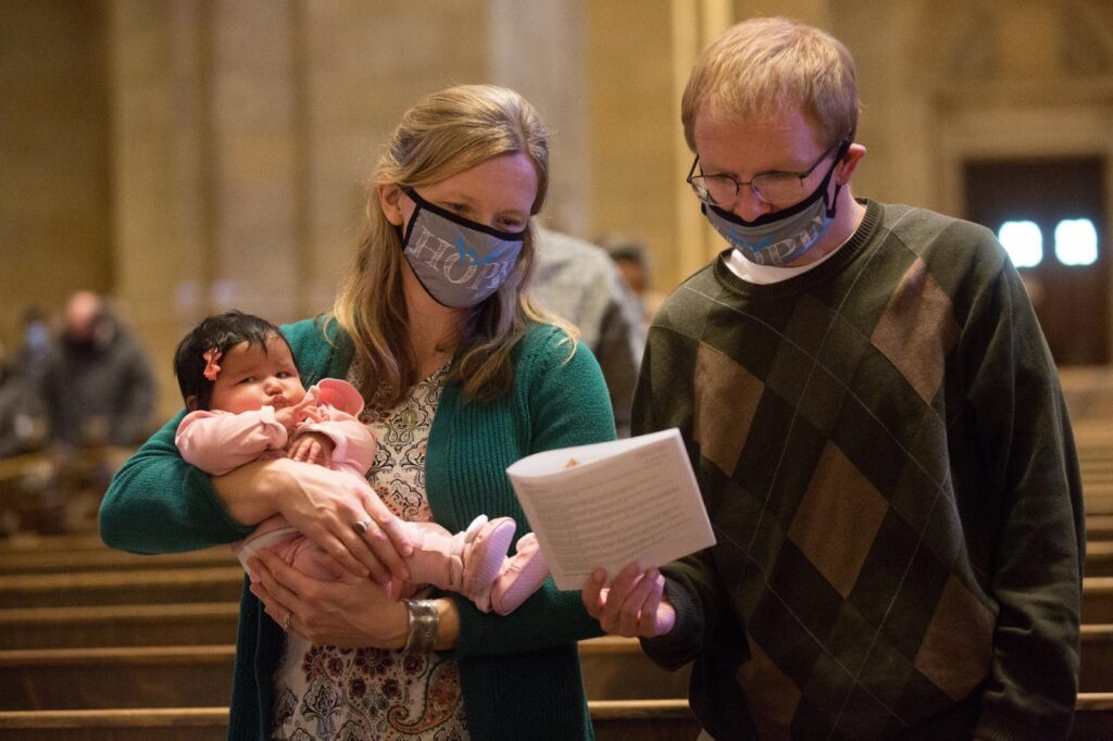 Angie and Mike Fuith of St. Michael Parish in Stillwater, Minn., attend the annual Prayer Service for Life with their 3-month-old daughter, Gianna, at the Cathedral of St. Paul in St. Paul, Minn., Jan. 22, 2021. They are in the process of adopting the baby after her birth mom chose life and agreed to an open adoption with the Fuiths. (CNS photo/Dave Hrbacek, The Catholic Spirit)