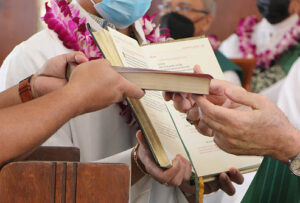 Bishop Silva hands a deacon candidate a Bible in the Rite for the Institution of Lectors. (HCH photo | Anna Weaver)