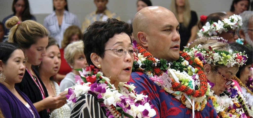 Barbara Yamasaki of the Hawaii Catholic Schools office sings at the 2015 Mass for the Annual Conference for Catholic Educators, Jan. 30, at Sacred Hearts Academy. She was honored that year for where she was honored for 50 years in Catholic education. (HCH photo | Darlene Dela Cruz)