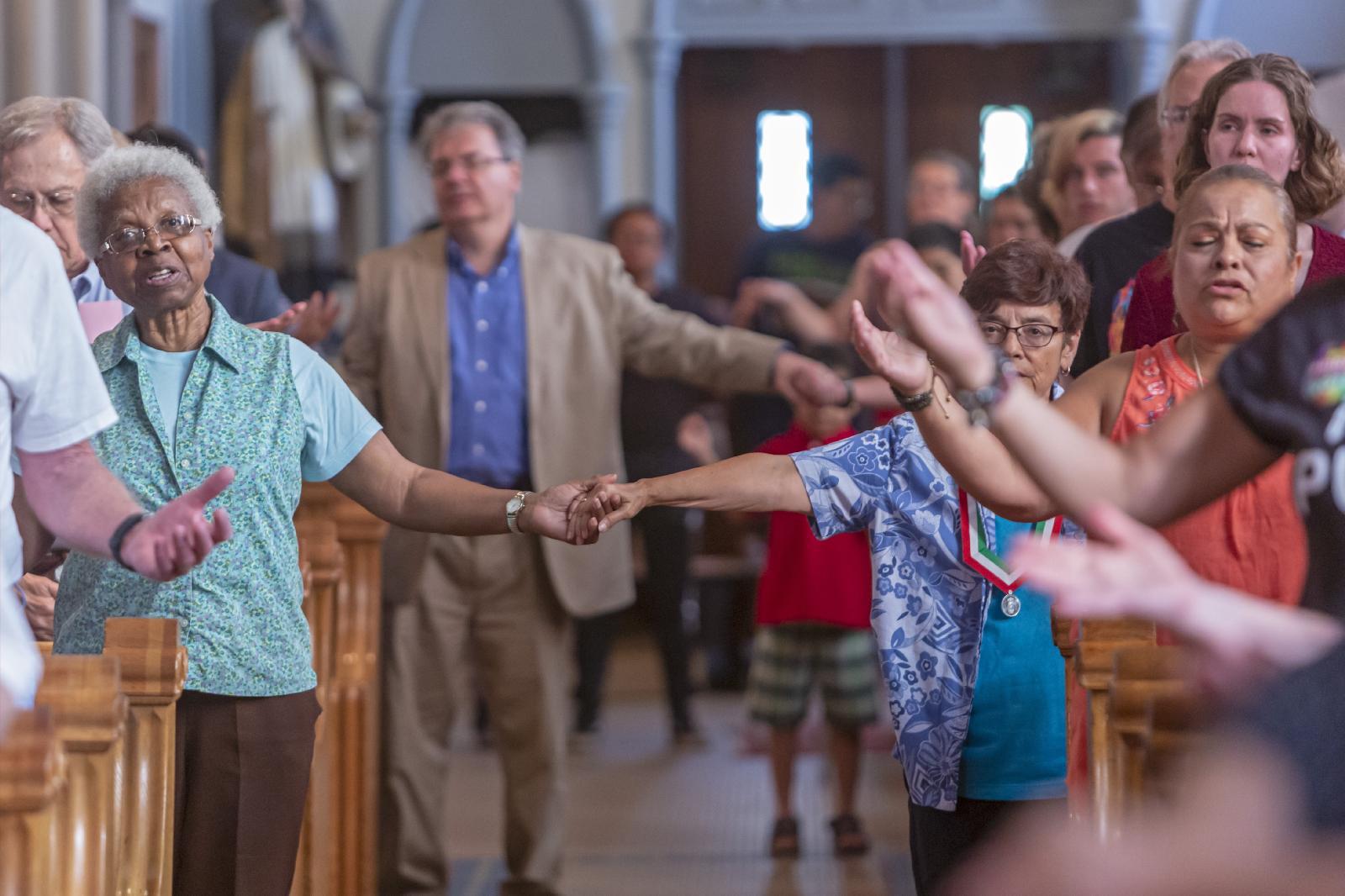 Worshippers join hands during the Our Father at Detroit’s Most Holy Trinity Catholic Church July 30, 2019, during a Mass for immigrant families that are separated or in detention. (CNS photo/Jim West)