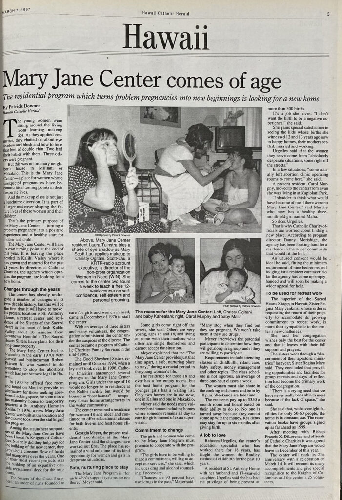 The primary purpose of the Mary Jane Center is turning a problem pregnancy into a positive experience and a healthy start for mother and child. … The center will have its own turning point at the end of this year. It is leaving the place nestled in Kalihi Valley where it has grown and matured for the past 21 years [St. Anthony Retreat Center].
