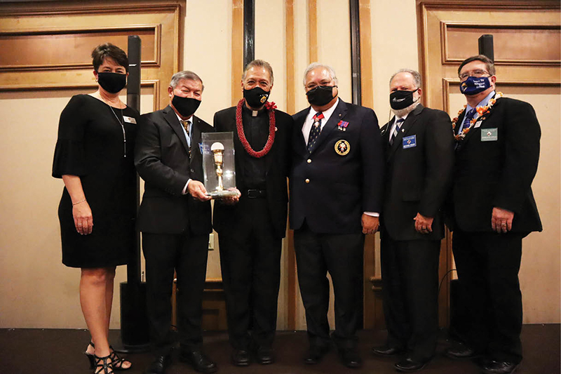 The night began with an invocation by Bishop Larry Silva. The U.S. and Hawaii flags were presented by the Hawaii Fourth Degree Color Corps, followed by the singing of the national and Hawaii state anthems. After a delicious buffet dinner, immediate past State Deputy Michael M. Madix and current State Deputy Ryan K. Brown presented the awards for the 2019-2020 and 2020-2021 fraternal years.