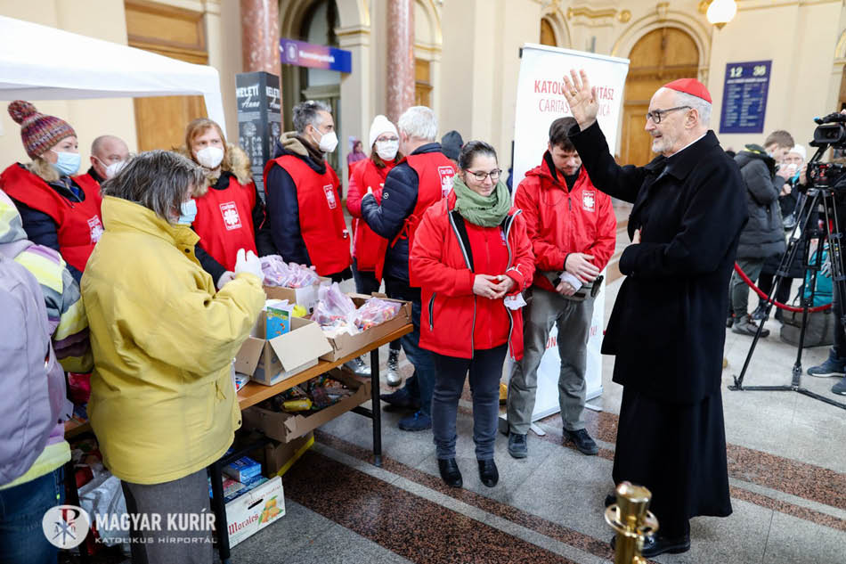 Canadian Cardinal Michael Czerny, interim president of the Dicastery for Promoting Integral Human Development, gives a blessing to Caritas workers during a visit to meet Ukrainian refugees arriving at the Keleti train station in Budapest, Hungary, March 8, 2022. (CNS photo/courtesy Magyar Kurír)