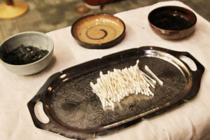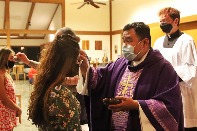 Father Alfred Omar Guerrero, pastor of the Newman Center and Holy Spirit Parish at the University of Hawaii-Manoa, applies ashes to the forehead of a parishioner with a Q-tip, on Ash Wednesday, March 2 at the Newman Center. At right, Q-tips, used to avoid the spread of the COVID-19 virus, and bowls of ashes sit on a tray. (Photos courtesy of Dann Ebina)