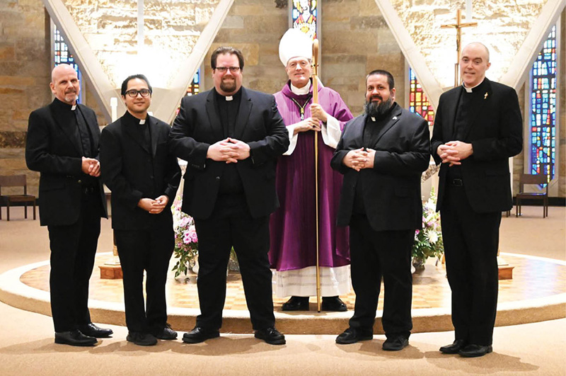 John Akau, a seminarian for the Diocese of Honolulu, was instituted as a lector at Sacred Heart Seminary and School of Theology in Wisconsin with four others by Bishop Robert M. Coerver of Lubbock, Texas, on March 9. The ministry of lector, which allows him to read the Scripture readings at Mass, except the Gospel, is one of three first steps to ordination, the others being candidacy and acolyte. Pictured, from left, are Randy Recker, Akau, Daniel Dunn, Bishop Robert Coerver, Daniel Christe and Robert Dodson. (Photo courtesy of Sacred Heart Seminary and School of Theology)