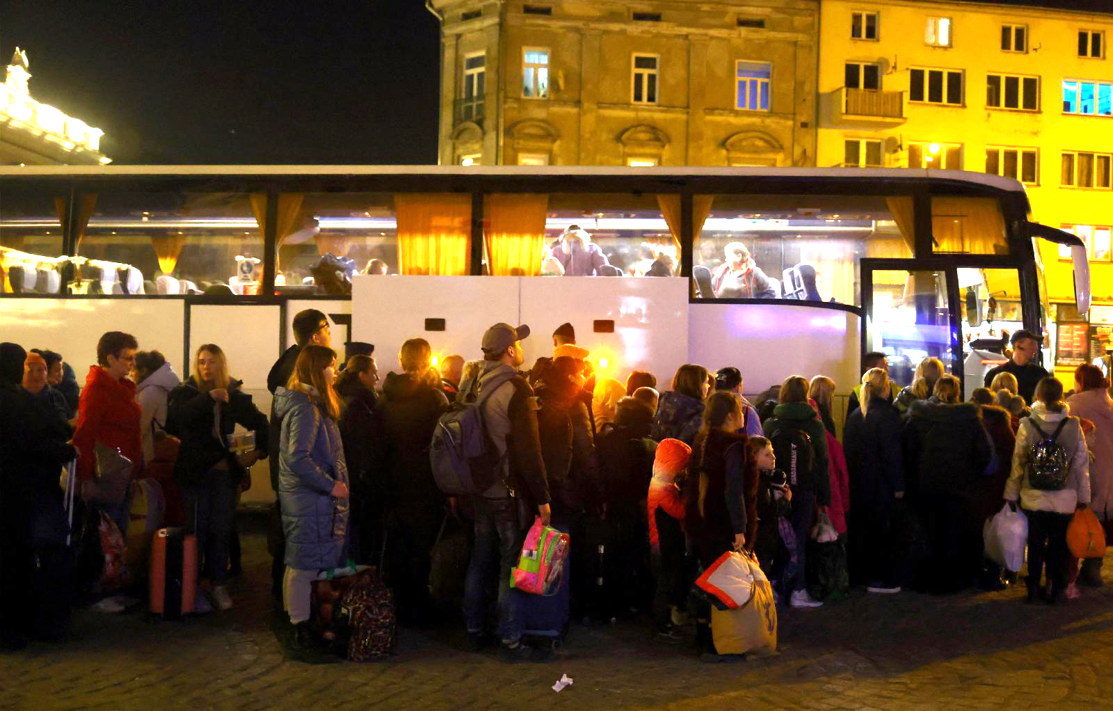 Ukrainian refugees in Przemysl, Poland, wait to board a bus to take them to a temporary shelter March 23, 2022, after fleeing the Russian invasion. (CNS photo/Hannah McKay, Reuters)