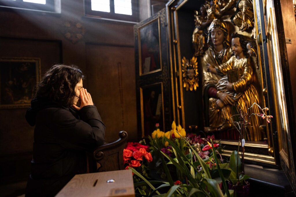 A woman prays during the funeral for a fallen Ukrainian soldier at a church in Lviv, Ukraine, March 11, 2022, during the Russian war. (CNS photo/Alex Kent)
