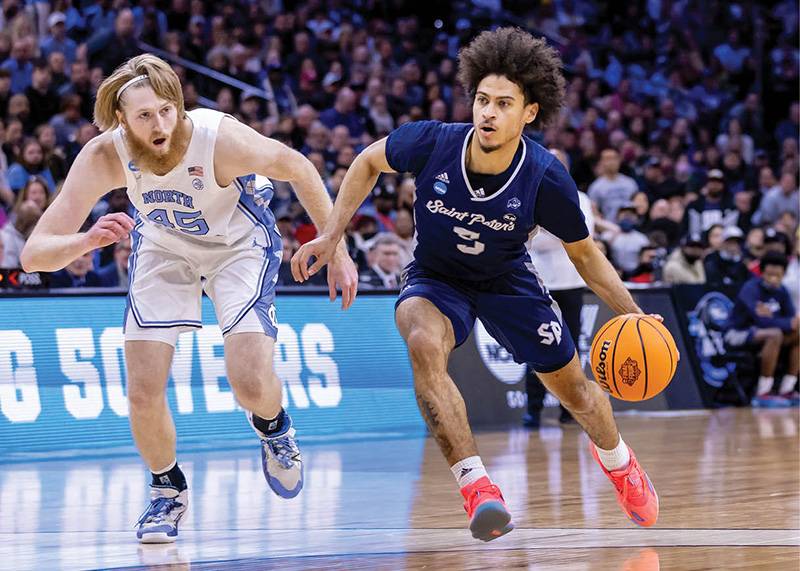 Daryl Banks III of Saint Peter’s University dribbles the ball March 27, 2022, during the Peacocks’ NCCA March Madness game against the University of North Carolina in Philadelphia. The Tar Heels won the East regional final 69-49. (CNS photo/Rich Schultz, Stockton Photography, courtesy Saint Peter’s University)