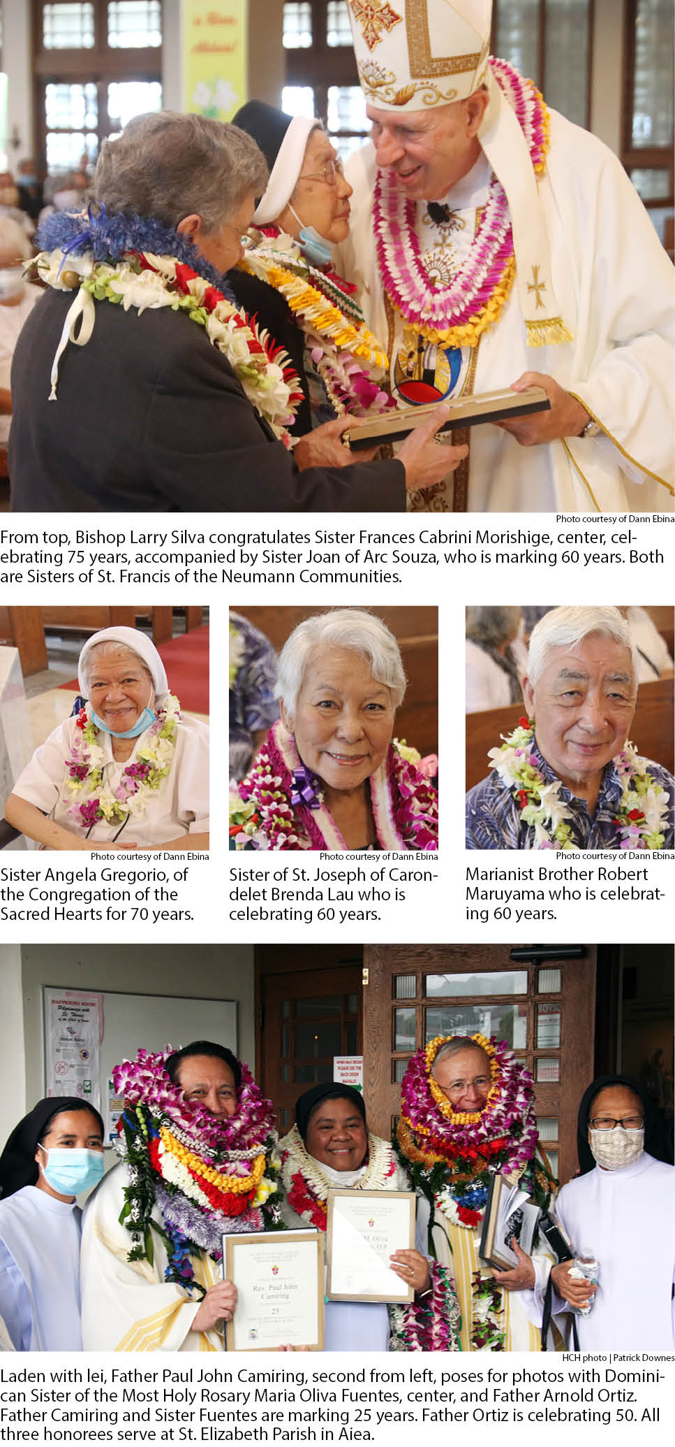 Twenty-two religious women and men and priests celebrating milestones in ministry were honored by the Diocese of Honolulu at the annual jubilarian Mass on the morning of April 23 at the Co-Cathedral of St. Theresa in Honolulu.