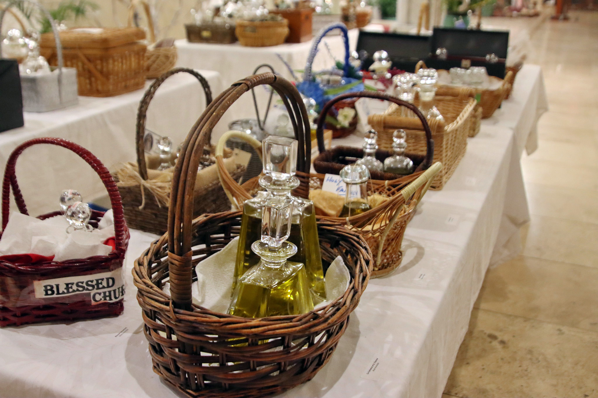 Baskets of oils ready to go back to their respective parishes.