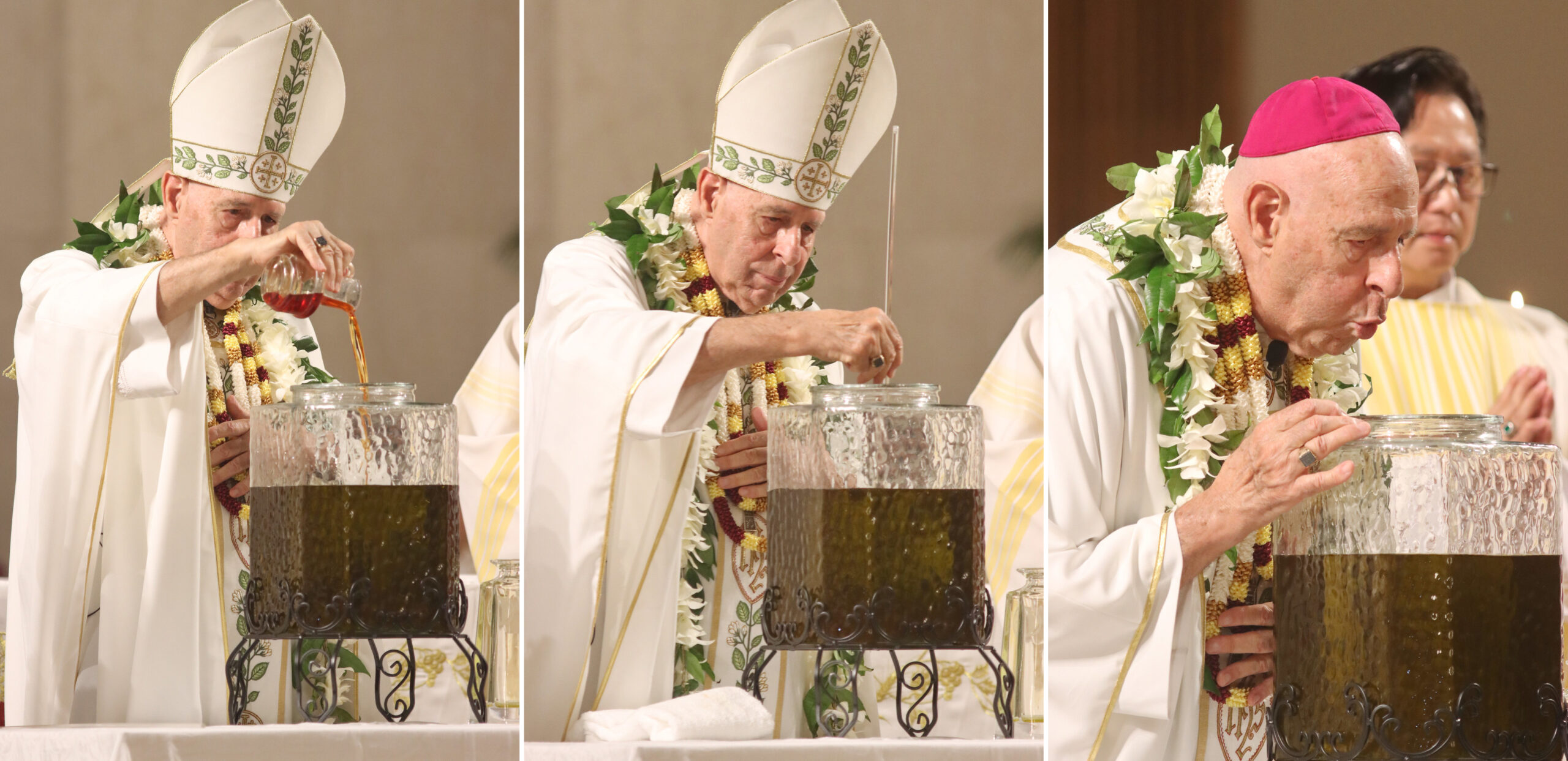 Bishop Larry Silva pours and stirs balsam into the Chrism oil and then breaths the “breath of the Holy Spirit” into the sacred oil. at the April 12, 2022, Chrism Mass at the Co-Cathedral of St. Theresa in Honolulu.