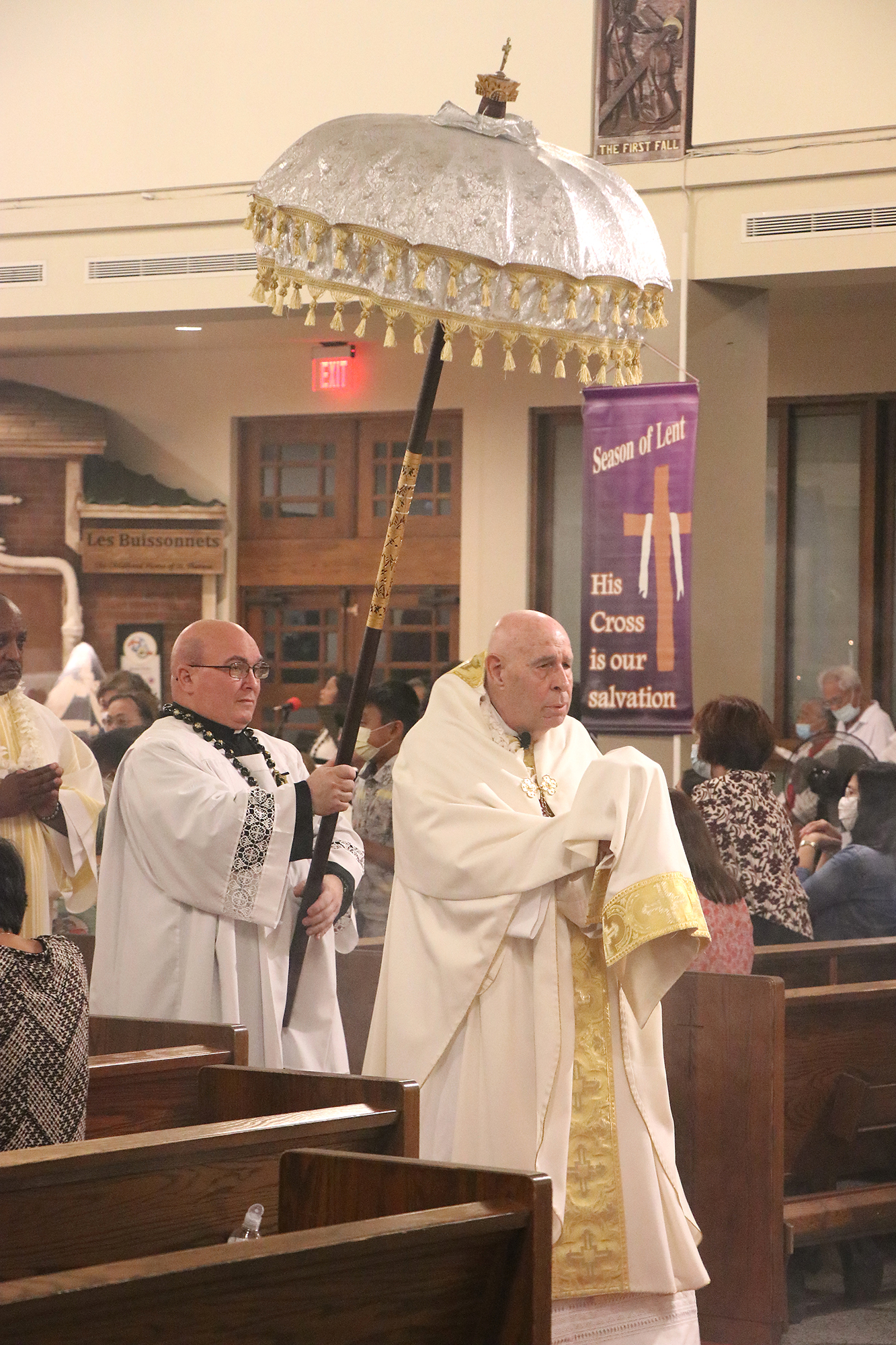 The Celebration of the Passion of the Lord was celebrated at noon at the Cathedral Basilica of Our Lady of Peace. It was a communion service as no Masses are held on Good Friday. This year, one of the petitions was for the end of the coronavirus crisis, and the Veneration of the Cross was done differently. Instead of people touching the cross, it was carried section by section throughout the church for people to stand and bow or kneel in front of.