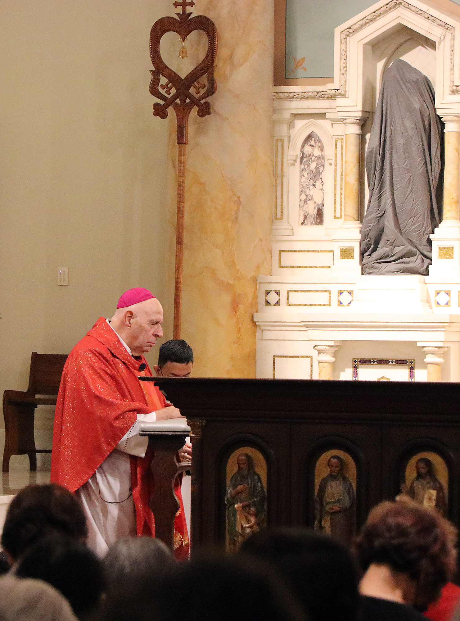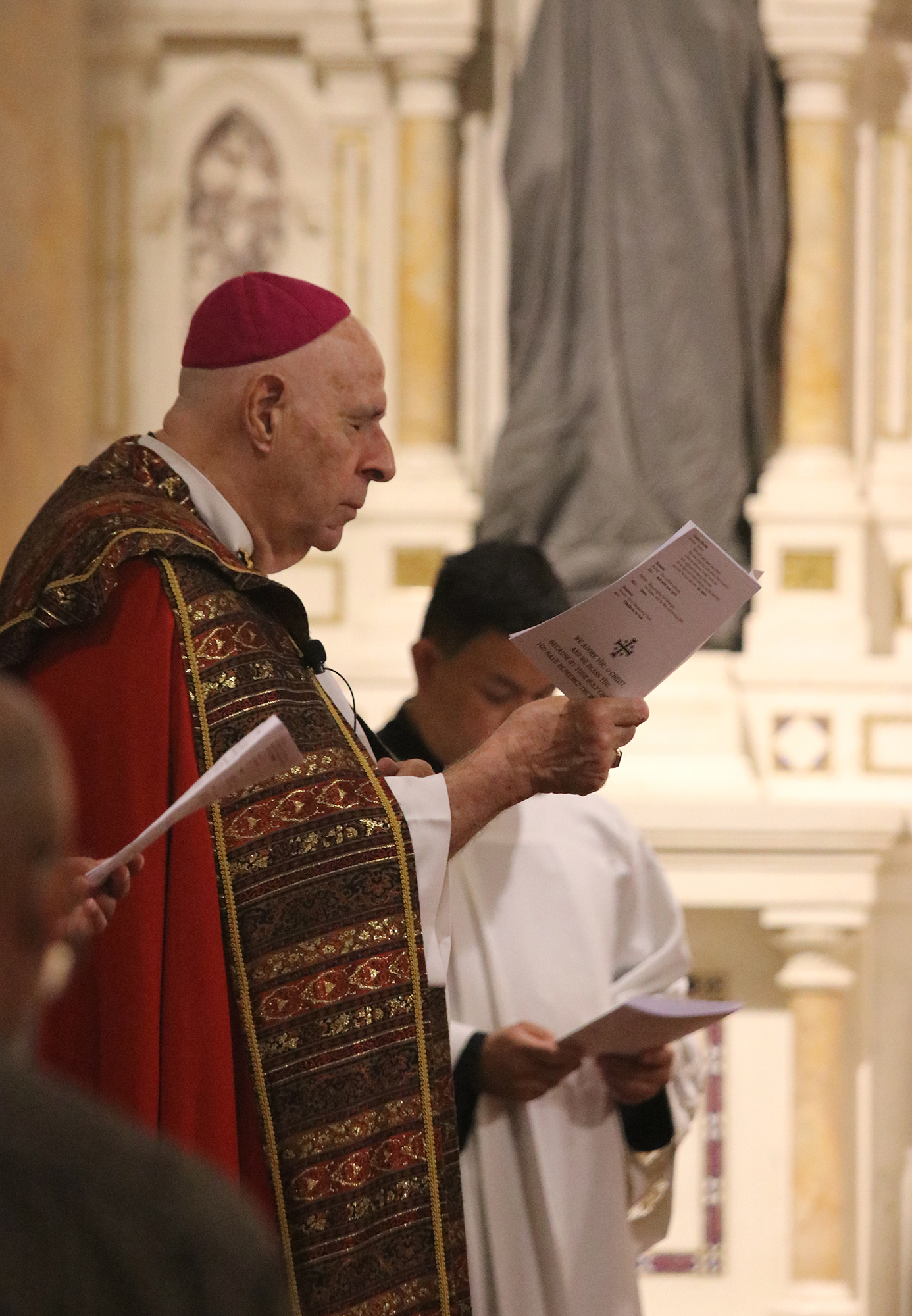 Bishop Silva prays with eyes closed during the Good Friday Morning Prayer service at the Cathedral Basilica of Our Lady of Peace in downtown Honolulu on April 15. (HCH photo: Anna Weaver)