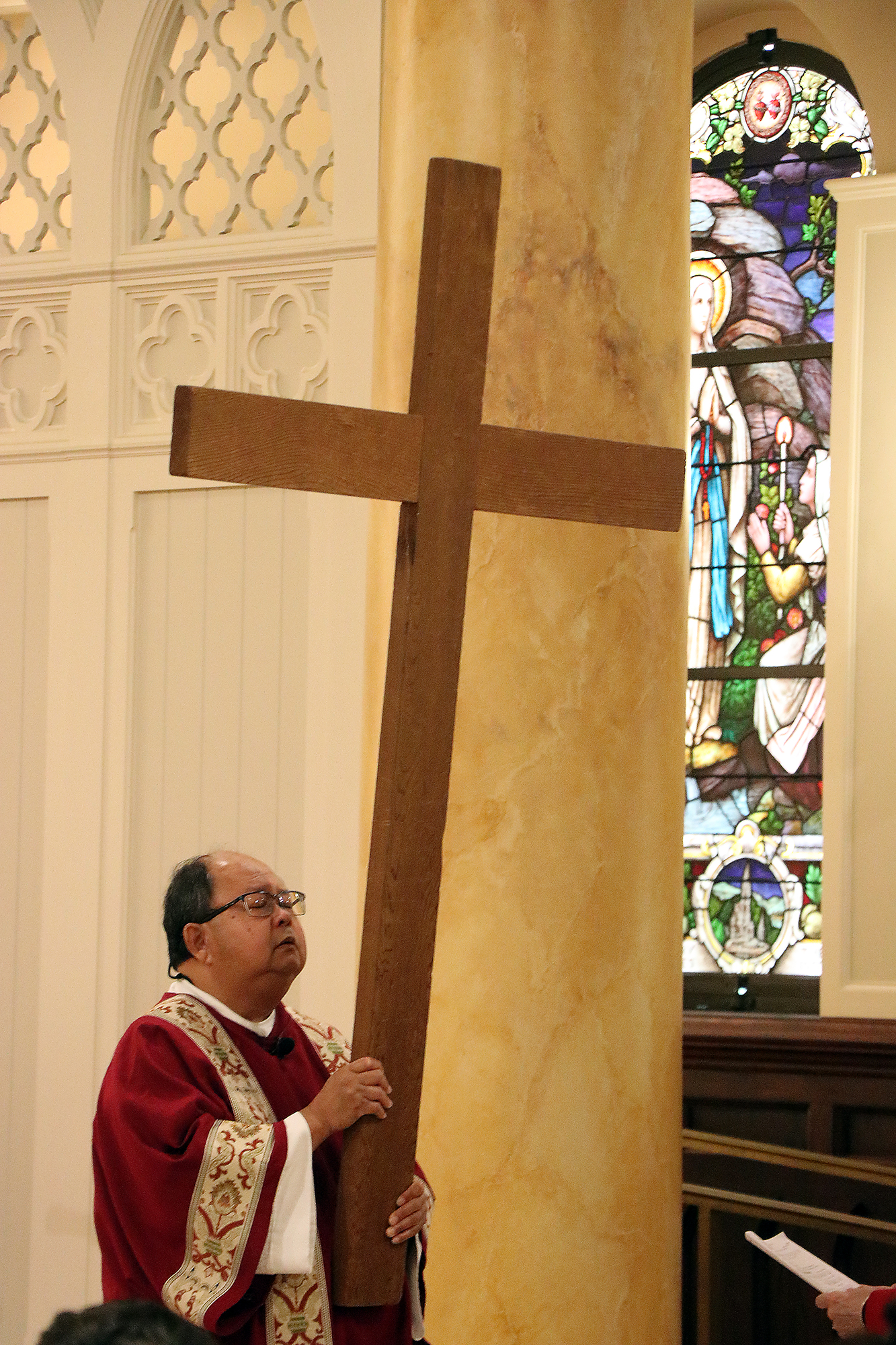 The cross is carried to the front of the cathedral basilica for veneration during the Celebration of the Passion of the Lord, April 14. (HCH Photo: Anna Weaver)