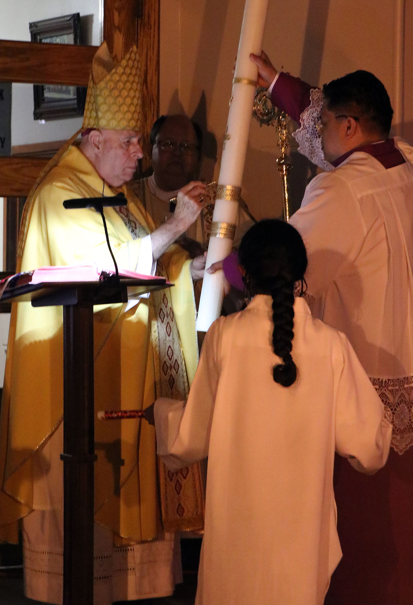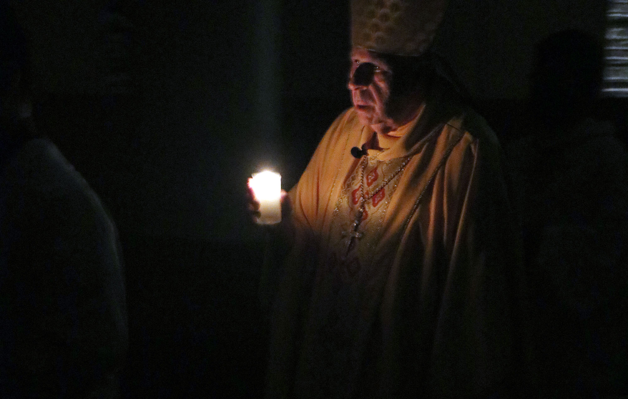 Bishop Silva with a candle as the Easter Vigil moves inside the Cathedral Basilica of Our Lady Peace on April 16. (HCH Photo: Anna Weaver)