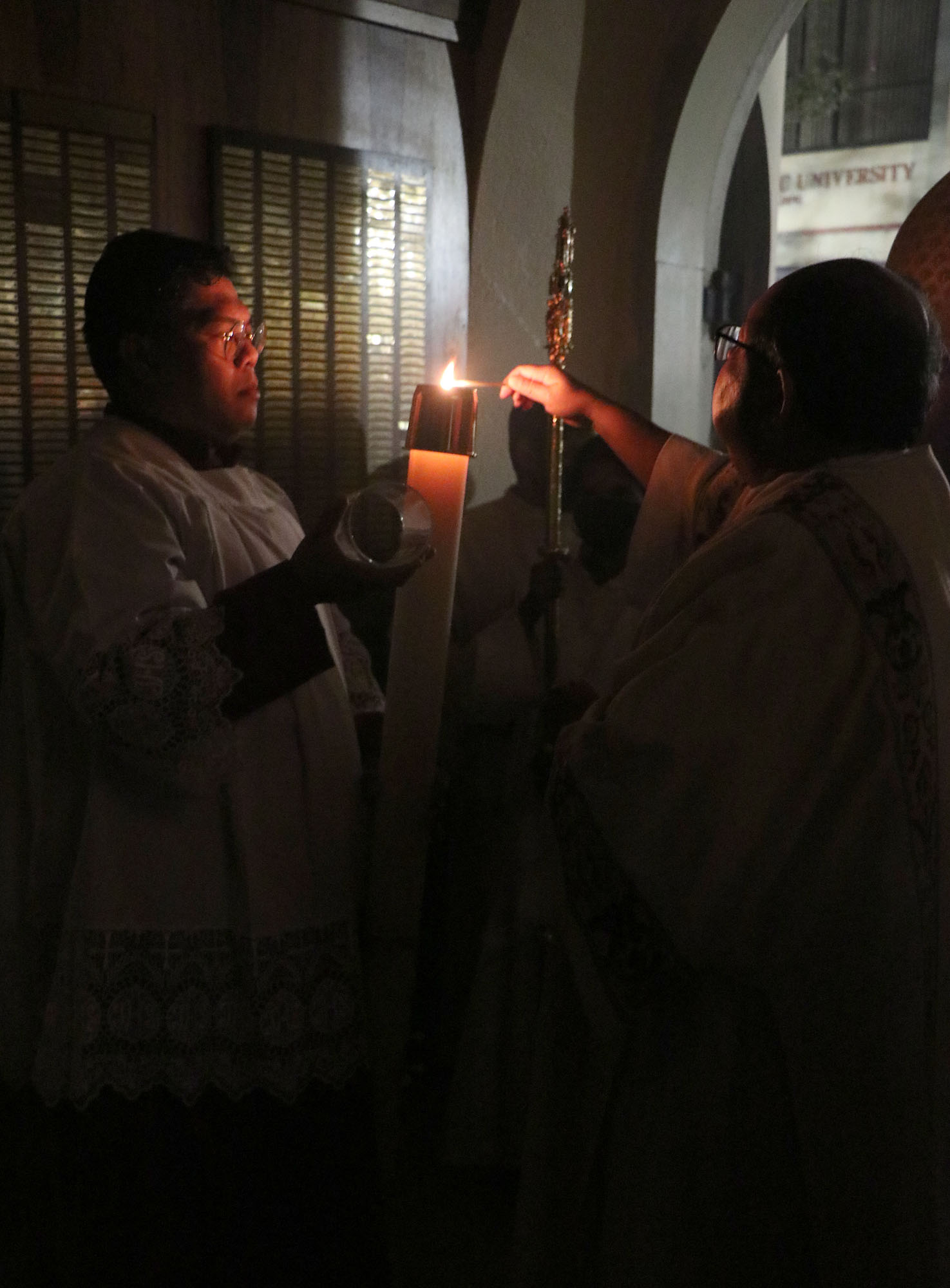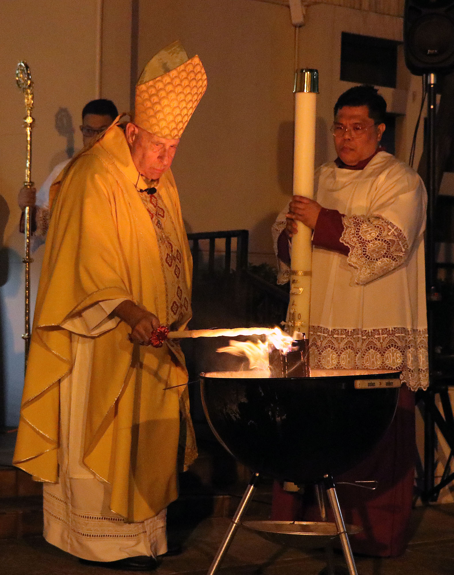 Bishop Silva prepares to light the new Paschal Candle at the start of the Easter Vigil outside the Cathedral Basilica of Our Lady Peace on April 16. (HCH Photo: Anna Weaver)