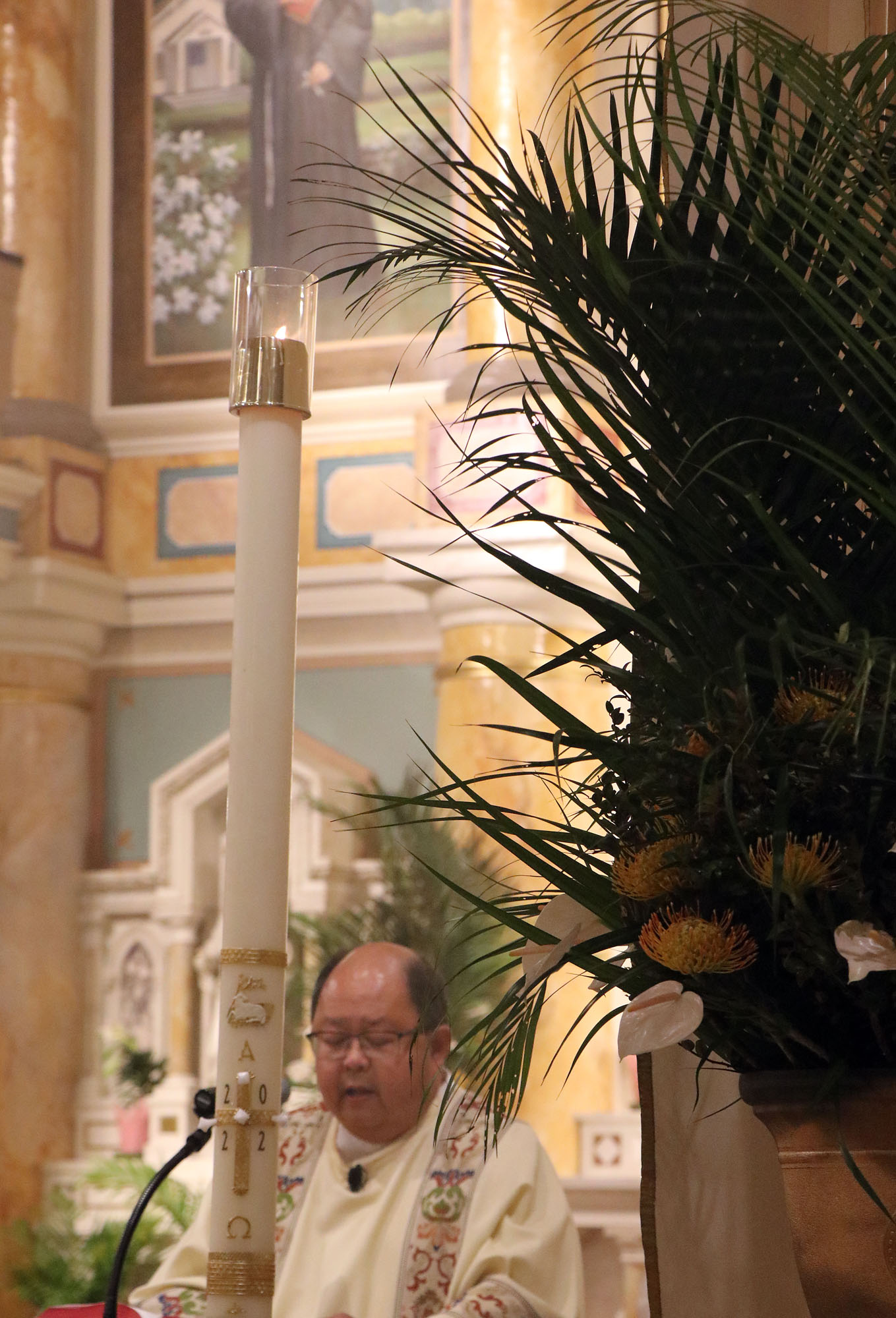 Deacon Joseph Almuena takes a light from the new Paschal Candle as smaller candles are light throughout the Cathedral Basilica of Our Lady Peace on April 16. (HCH Photo: Anna Weaver)