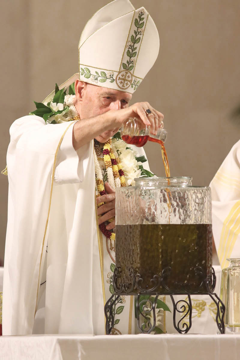 Bishop Larry Silva pours aromatic balsam into olive oil to create the sacred oil called chrism, one of three holy oils the bishop blessed at the Chrism Mass, April 12 in the Co-Cathedral of St. Theresa. The other oils are the oil of the sick and the oil of catechumens. (Photo: Dann Ebina)