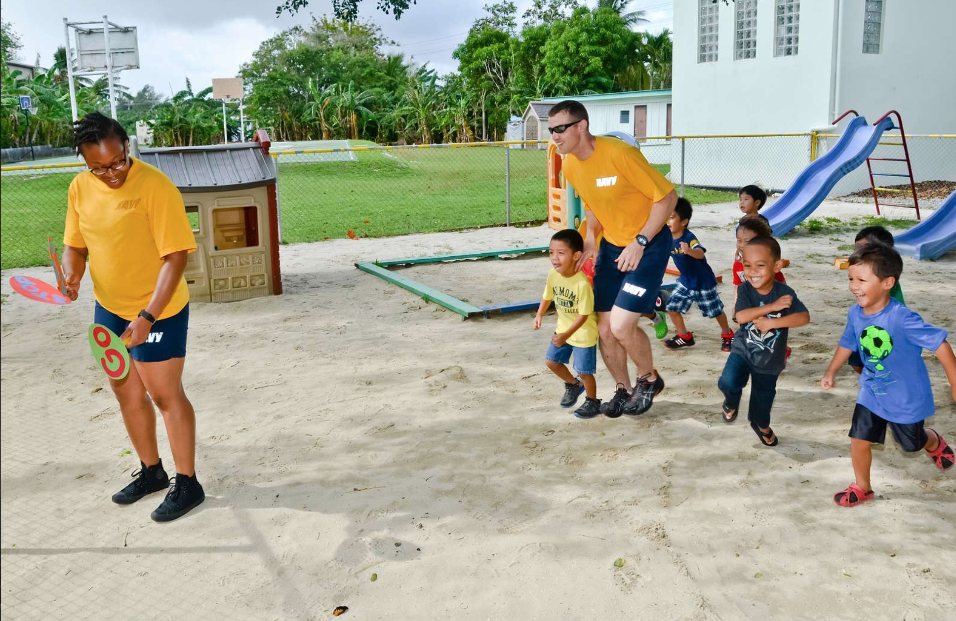 Engineman 3rd Class Blanca King, left, and Chaplain Lt.j.g. Nathanael Gentilhomme, center, both Sailors assigned to the submarine tender USS Frank Cable (AS 40), play a game with children from the Saipan Seventh-Day Adventist (SDA) School and Child Development Center, April 9, 2015, in Chalan Kiya, Saiapan (U.S. Navy photo by Mass Communication Specialist 2nd Class Jonathan T. Erickson/Released, Public Domain)