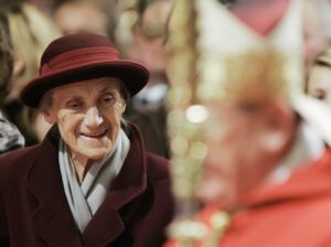 Franziska Jagerstatter, the 94-year-old widow of Blessed Franz Jagerstatter, attends her husband’s beatification ceremony at St. Mary’s Cathedral in Linz, Austria, Oct. 26 (CNS photo/Reuters)