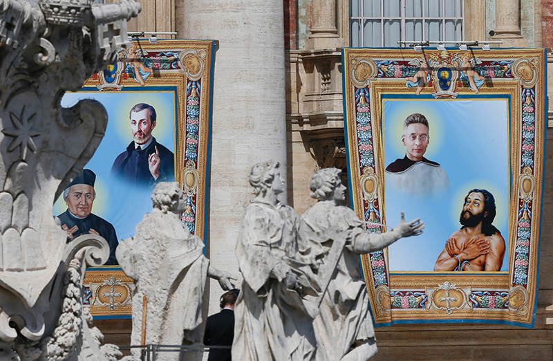 Banners of new saints hang from the facade of St. Peter’s Basilica as Pope Francis celebrates Mass for the canonization of 10 new saints in St. Peter’s Square at the Vatican May 15, 2022. Pictured from left are Luigi Maria Palazzolo, Italian founder of the Congregation of the Sisters of the Poor, who lived 1827-1886; César de Bus, the French founder of the Fathers of Christian Doctrine, who was born in 1544 and died in 1607; Titus Brandsma, Dutch priest and journalist, who was born in 1881 and martyred in 1942, Devasahayam Pillai, an Indian layman born in 1712 and martyred in 1752. (CNS photo/Paul Haring)