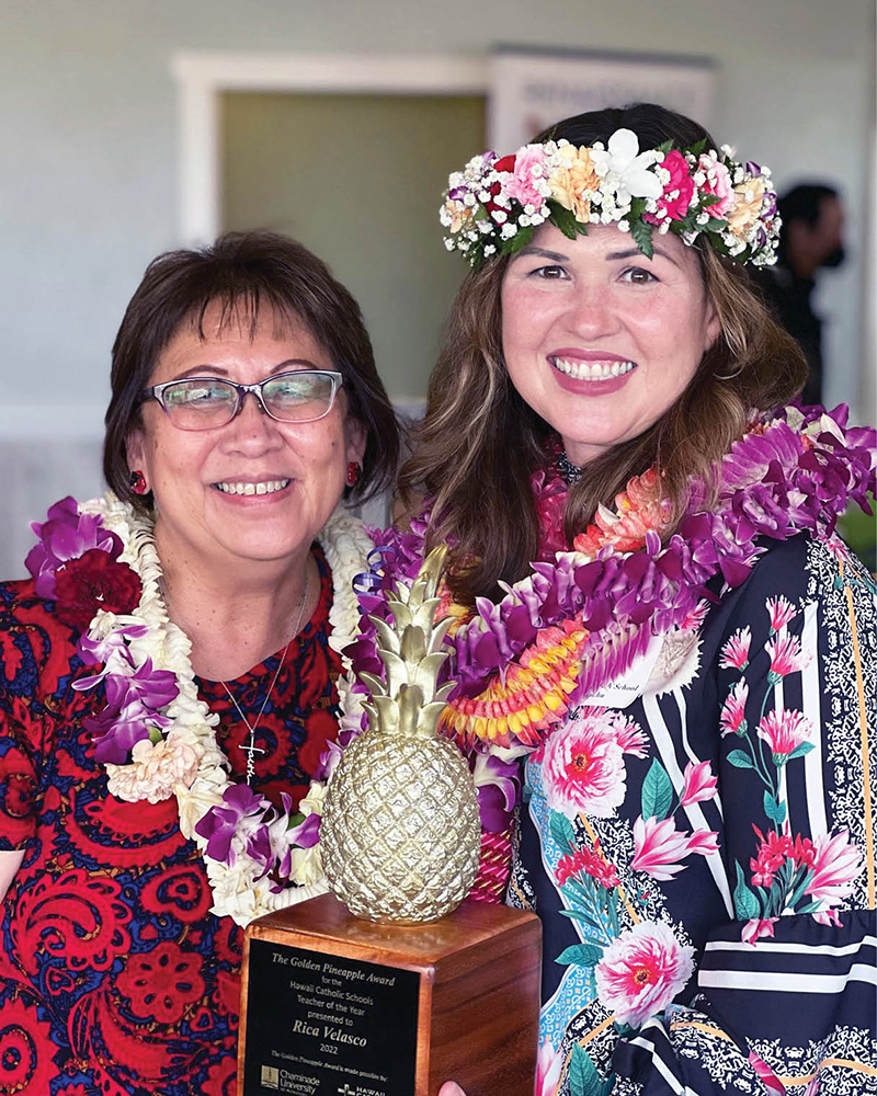 Rica Velasco, right, of St. Joseph School in Waipahu is the 2022 Golden Pineapple Teacher of the Year awardee. She was recognized at the annual Hawaii Catholic Schools Recognition Luncheon on May 19 at the Natsunoya Tea House in Honolulu. The award is given by the Hawaii Catholic Schools office, Chaminade University of Honolulu, and John C. and Mary Lou Brogan. Pictured with her is St. Joseph principal Beverly Sandobal. (Photo courtesy of Hawaii Catholic Schools)