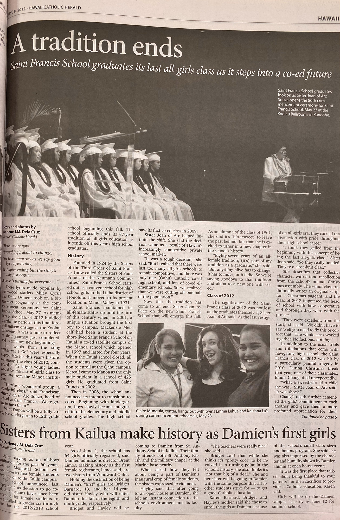 At the commencement ceremony for Saint Francis School, May 27 … the words from the song “Wherever I Go” were especially appropriate for this year’s historic ceremony. The class of 2012, comprised of 52 bright young ladies, would be the last all-girls class to graduate from the Manoa institution. …