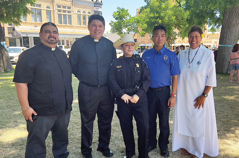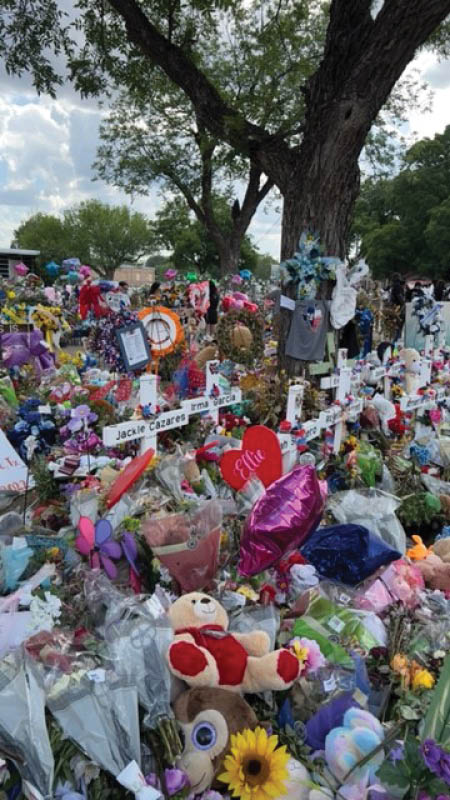 Hawaii Benedictine Sister Celeste “CC” Cabral poses June 4 with priests and officials in Uvalde, the small Texas town rocked by the school massacre of 19 students and two teachers May 24. She was part of a small delegation formed to bring aloha last weekend to the grieving community. The group delivered a mile-long ti leaf lei created by the Maui and Oahu organization called Lei of Aloha for World Peace. Right, flowers and memorial crosses in front of the Robb Elementary School where the shootings took place. (Photos courtesy of Sister Celeste “CC” Cabral)