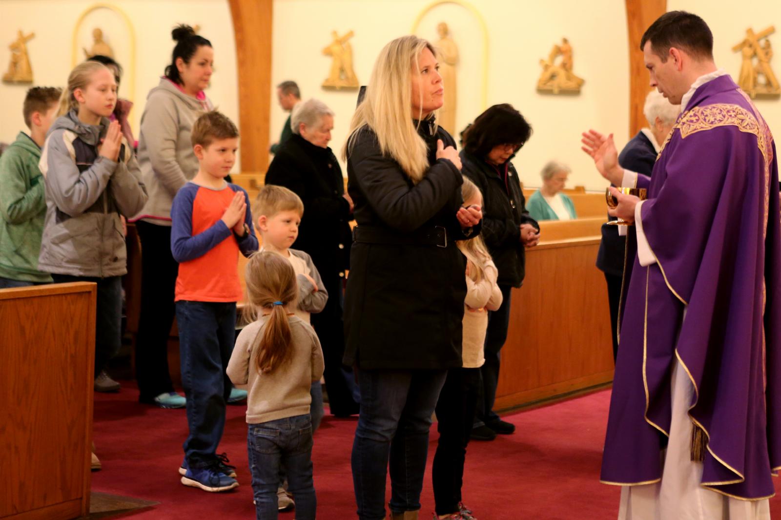 Amy Laddbush makes the sign of the cross after receiving Communion during a March 6 Mass at St. Pius X Church in Bowie, Md. with several of her 11 children. (CNS photo/Chaz Muth)