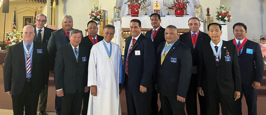 The Hawaii state officers of the Knights of Columbus gather for a photo after the May 8 Mass at which they were installed. In the front row, from left, are Paul Maple, state warden; Randy Tom, state secretary; Father Lane Akiona, state chaplain; Ryan Brown, state deputy; Patrick Guzman, state treasurer; Alex Ty, state advocate. In the back row, from left, Chuck Furr, executive director; Lito Alvarez, district master; RJ Juanillo, district deputy; Alex Manansala, district deputy; Larry Gonzales, district deputy; Melvin Cervantes, district deputy. (Photo courtesy of the Knights of Columbus)