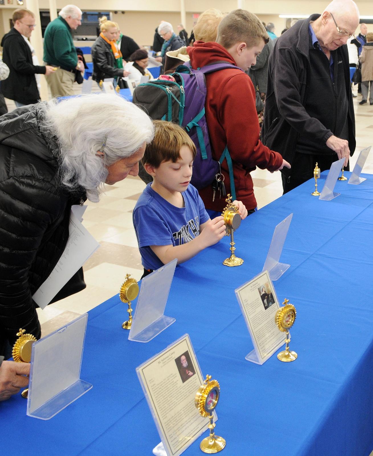 Christian Knob, 8, holds a relic of a saint as he and others look at sacred relics on display at Our Lady of Mount Virgin Church in Middlesex, N.J., March 16, 2019. They were part of a traveling display called “Treasures of the Church.” (CNS photo/Ed Koskey Jr., The Catholic Spirit)