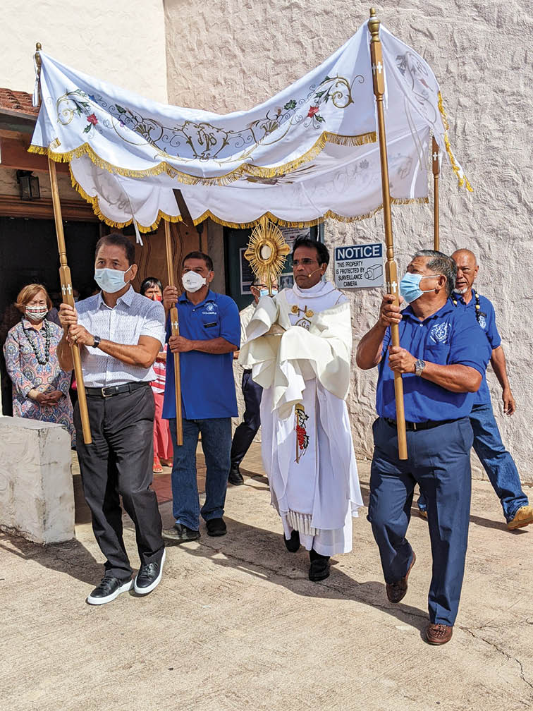 La Salette Father Augustine Uthuppu, pastor of Christ the King Parish in Kahului, Maui, carries the monstrance holding the Blessed Sacrament under a canopy held by members of the Knights of Columbus as he leads parishioners in a procession celebrating the feast of Corpus Christi (the Body of Christ) June 19. The Corpus Christi procession makes known God’s presence in our world and in our lives, and it reminds us of our common call to follow Christ and seek Heaven. (Photo courtesy of Caroline Sadiri)