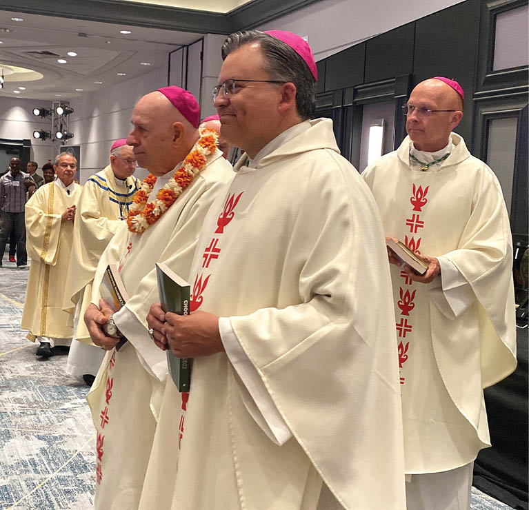Bishop Larry Silva of Honolulu, left, Auxiliary Bishop Robert G. Casey and Bishop James S. Wall of Gallup, N.M. process into the June 23 opening Mass of the “Alive in Christ: Young, Diverse, Prophetic Voices Journeying Together” national multicultural gathering in Chicago. The culturally diverse groups represented there were: Asian and Pacific Islander, Black and African American, European American, Hispanic and Latino, Native American and Alaska Natives, as well as migrants, refugees and travelers. The June 23-26 event was hosted by the U.S. Conference of Catholic Bishops and led by the bishops’ Committee on Cultural Diversity in the Church and several USCCB secretariats. Also attending were Honolulu seminarian Taylor Mitchell, Hawaii catechist Dallas Taylor and former Hawaii resident and Paulist seminarian Chris Malano. (CNS photo/courtesy USCCB)