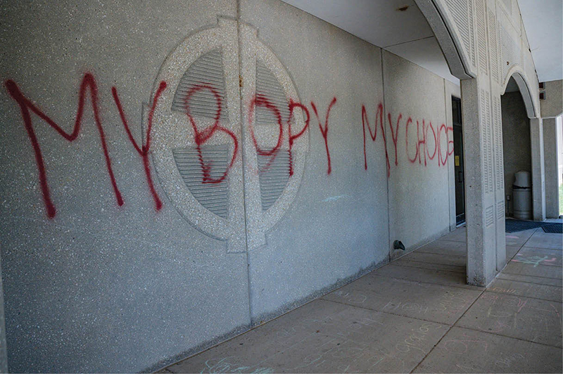 A wall at the grade school of the Church of the Ascension in the Overland Park, Kan., July 10, is seen with graffiti about abortion. This message was accompanied by another on the school’s front doors. The vandal or vandals also spray-painted a statue of Mary on the parish grounds. (CNS photo/courtesy The Leaven)