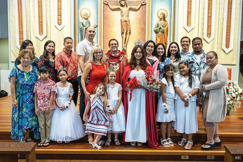 Father Anthony Rapozo, pastor at St. John Apostle and Evangelist Parish in Mililani, poses with the “royal court” of the parish’s first annual Holy Ghost Feast, June 5, Pentecost Sunday, at the 11 a.m. Mass. The Holy Ghost Feast is a traditional Portuguese cultural celebration introduced to the islands by Portuguese immigrants. Pictured with Father Rapozo are the Holy Ghost queen and four ladies-in-waiting and their families. The Mass was followed by a meal of Portuguese bean soup, malassadas and Portuguese sweet rolls for more than 200 people. The pastor is of Portuguese ethnicity. Other island parishes have also celebrated this tradition. (Photo courtesy of Ozzie Jaramillo)